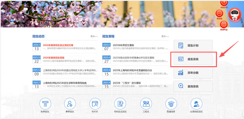 操作流程:招生网—— “报名系统”——“上海电机学院测试时间选择系统”(推荐使用火狐或谷歌浏览器)